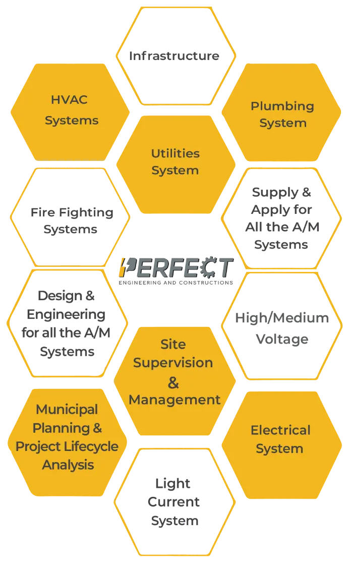 PERFECT's scope of operations includes Electro-mechanical engineering such as firefighting, HVAC, plumbing, utilities building, high, medium & low voltage, light current works.